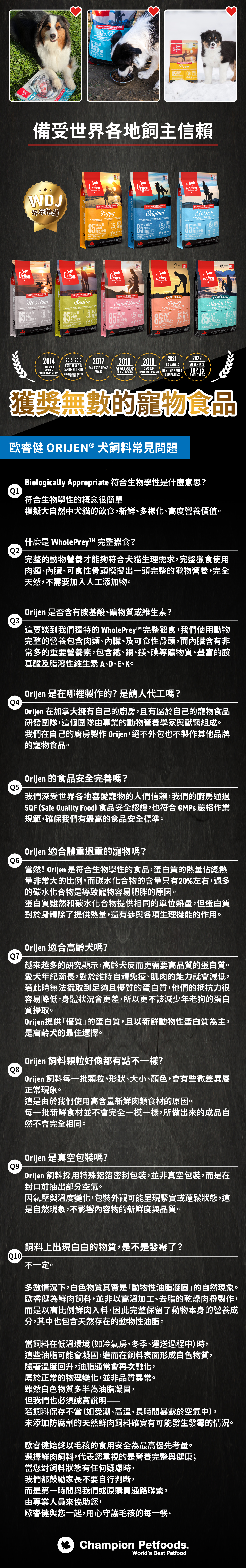 Orijen歐睿健 鮮雞高齡犬 無穀鮮肉犬糧Orijen歐睿健 鮮雞高齡犬 無穀鮮肉犬糧Orijen歐睿健 鮮雞高齡犬 無穀鮮肉犬糧 成分營養分析每日餵食量表
