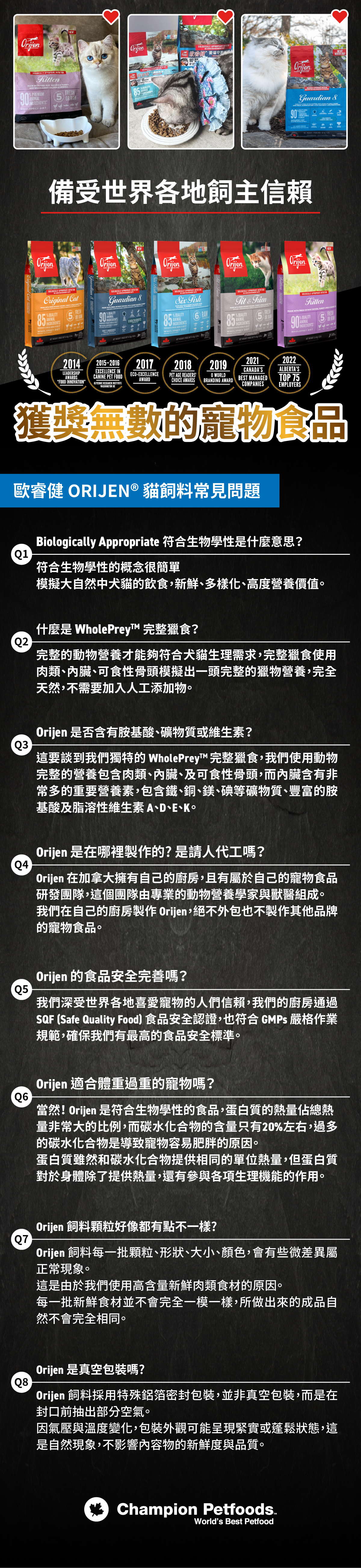 歐睿健 Orijen Fit & Trim 鮮雞室內貓,低卡路里配方,新鮮或生鮮雞肉、火雞肉、野生魚類為主要食材,讓貓咪獲得最佳營養,同時維持好體態。
