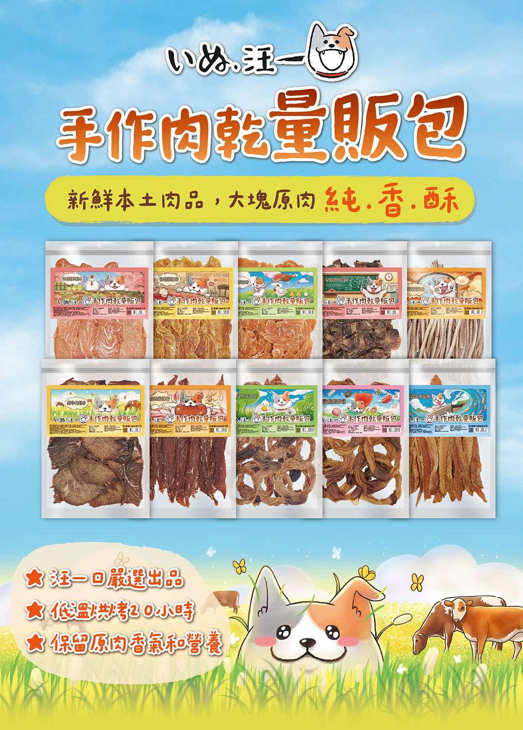 「汪一口」堅持台灣本土新鮮肉品,採用大塊原肉,低溫慢烤 20 小時以上,鎖住天然營養與鮮香肉味。全程無添加防腐劑、人工香料,單純到只有「肉」,就是你最放心的選擇。